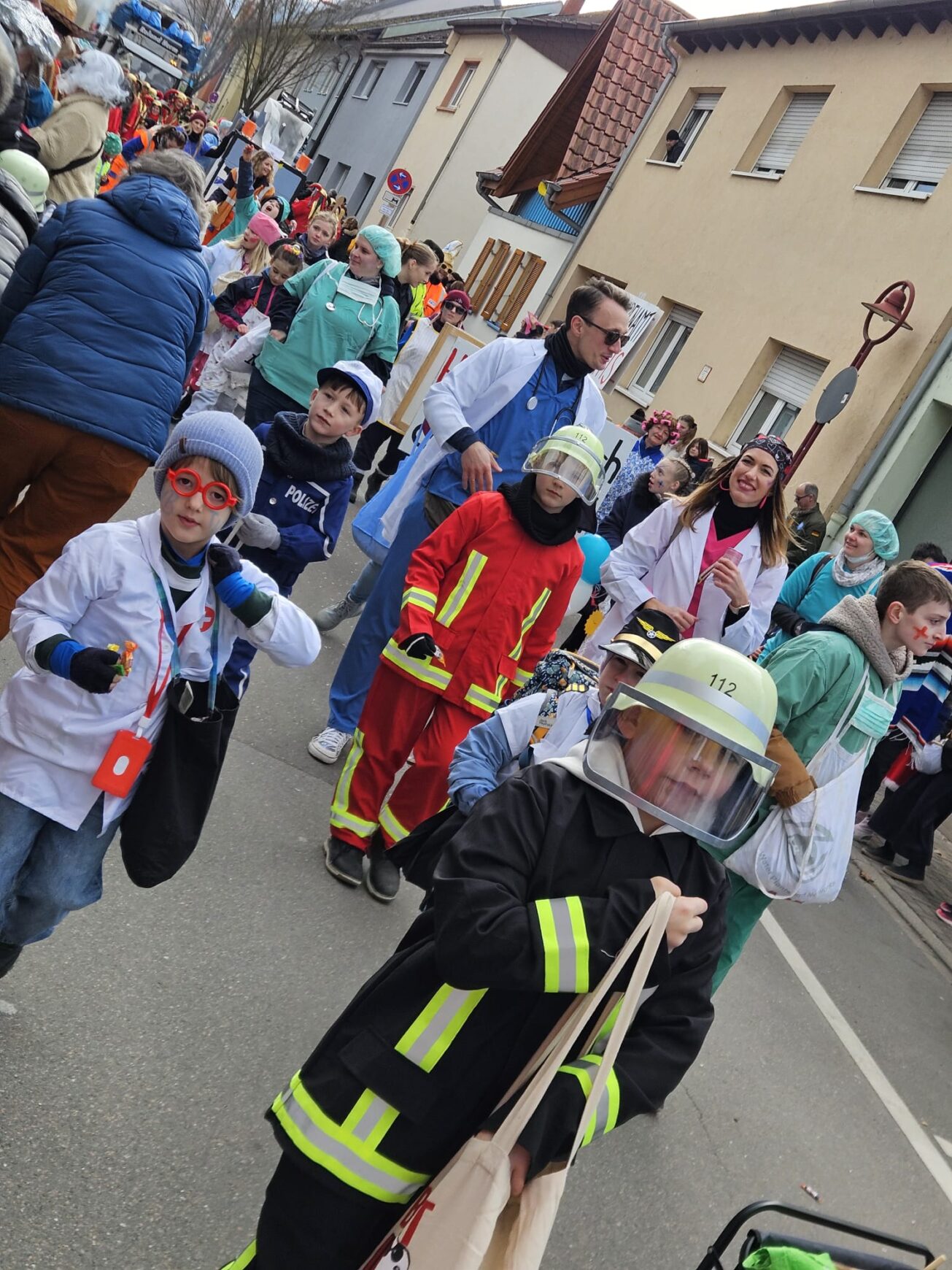Auch in diesem Jahr nahm der TV Brühl wieder mit seinen Faschingsnasen am 66. Brühler Fastnachtsumzug teil. Jung und Älter traf sich bereits am Vormittag des 17.02.2026 auf dem TV-Gelände, um die letzten Vorbereitungen zu treffen: Wagen fertigstellen, Verkleidung anziehen und die Taschen mit Süßigkeiten vollstopfen. Gemeinsam machte sich die bunte Truppe bestens gelaunt bei schönstem Sonnenschein dann auf den Weg zur Aufstellung, wo noch viele weitere Vereinskolleg:innen dazustießen. So liefen um 13.01 Uhr über 70 TV-Mitglieder verkleidet als Feuerwehrleute, Polizist:innen, Ärzt:innen, Putzkräfte, Müllwerker, Trainer:innen, uvm. entsprechend dem Motto „Alltagshelden – ohne euch geht’s nicht!“ durch die Brühler Hauptstraße. Mit viel Ahoi und Süßigkeiten hatten alle großen Spaß und so konnte man nach dem sehr kurzweiligen Umzug noch am Ende gemeinsam die anderen Zugnummern bewundern, die sich ebenfalls bei ihren Ideen richtig ins Zeug geworfen hatten.